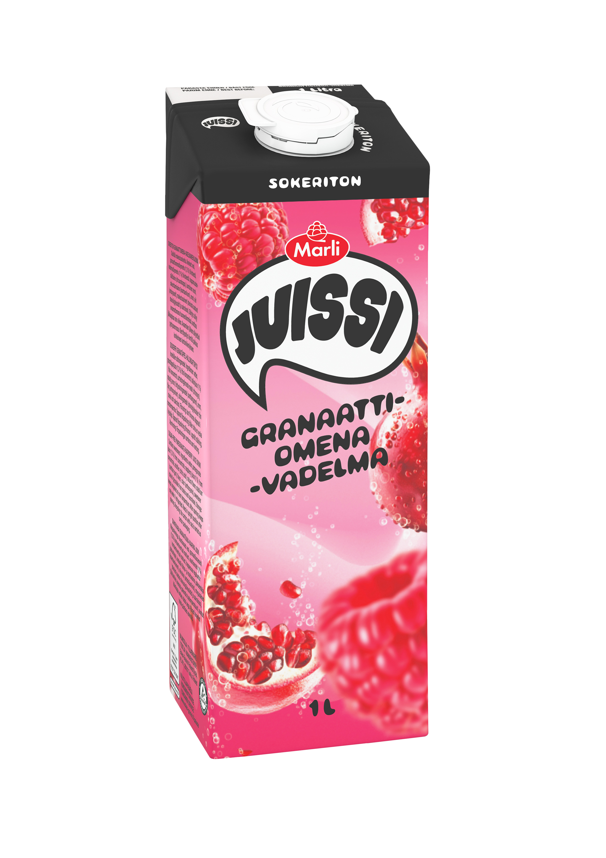 vesi, granaattiomenatäysmehu (1,7 %) tiivisteestä, vadelmatäysmehu (0,3 %) tiivisteestä, happamuudensäätöaine (sitruunahappo), sakeuttamisaine (ksantaanikumi), aromi, makeutusaineet (stevioliglykosidit ja sukraloosi), väri (antosyaani).