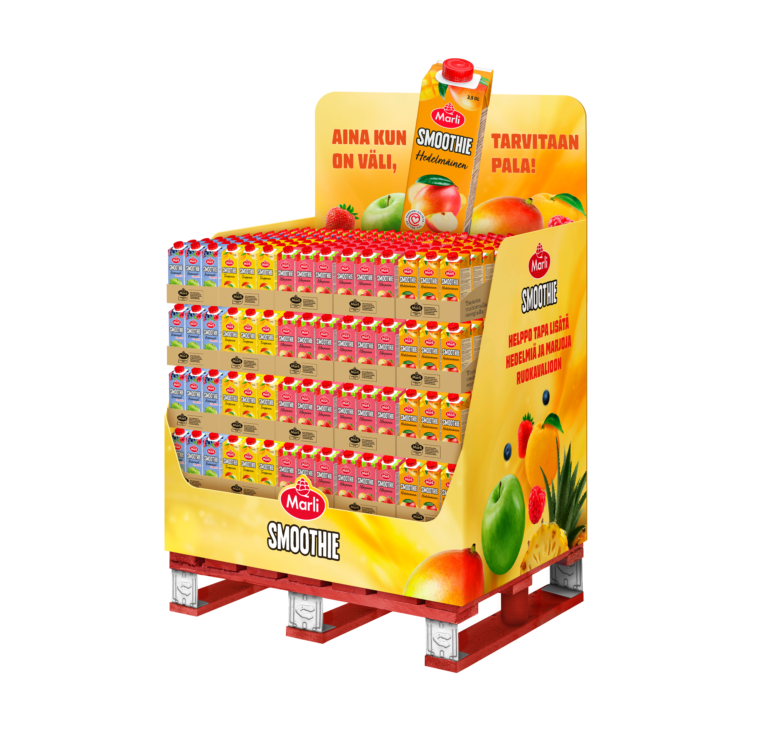 Marli Smoothie neljän maun sekateholavassa on 195 kpl (13 me) Trooppinen smoothieita, 255 kpl (17 me) Hedelmäinen smoothieita, 120 kpl (8 me) Kesämarjat smoothieita ja 255 kpl (17 me) Marjainen smoothieita. Vitaminoitu. Makeuttamaton. Sydänmerkki.