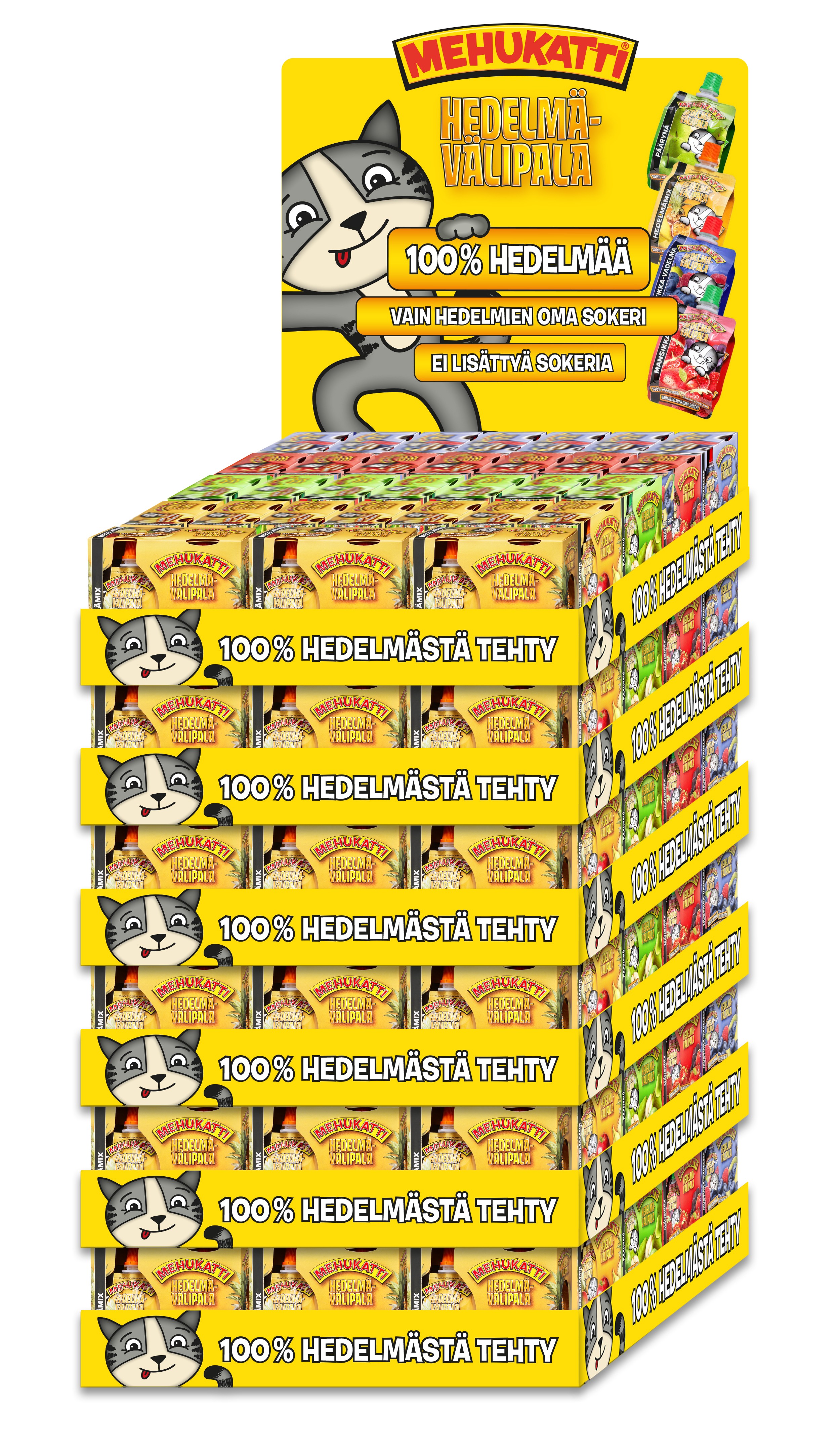 Mehukatti välipala neljän maun sekavarttilava. Lavassa on 186 kpl 4x90g välipalapakkauksia: 60x hedelmämix, 42x mansikka, 42x päärynä ja 42x mustikka-vadelma.